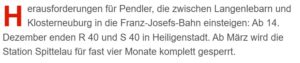 Achtung S40 und R40 Klosterneuburger-Pendler:innen ab Mitte Dezember! Die Schnellbahnverbindung endet wieder einmal in Heiligenstadt. Damit fällt der wichtige und schnelle Verbindungsanschluss zur U6 weg und ist nur über den Umweg Heiligenstadt U4 bis Spttelau möglich.
