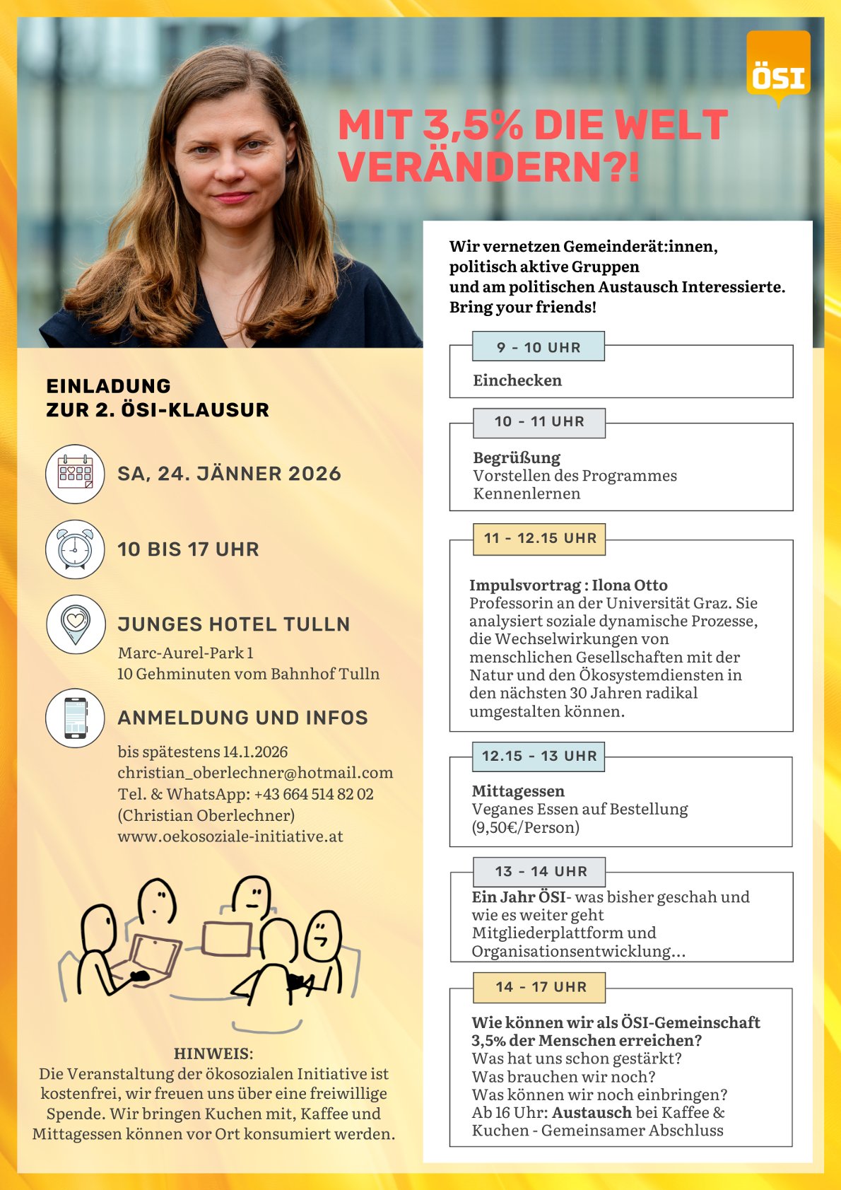 Spannend wird sicher der Gastvortrag von Ilona Otto / Uni Graz: „Mit 3,5% die Welt verändern?!“ und sowieso die gesamte Tagung! – Wer Interesse hat, an der Klausur teilzunehmen, melde sich, bitte, bei eurer/eurem PUK-Gemeinderät/-rätin eures Vertrauens 😉 verbindlich an (z.B. bei Ulli Kobrna: ulrike.kobrna@gruendenken.at). Die gesammelten Anmeldungen werden wir bis spätestens 14. Jänner an Christian Oberlechner schicken, der die ÖSI ins Leben gerufen hat und derzeit koordiniert.